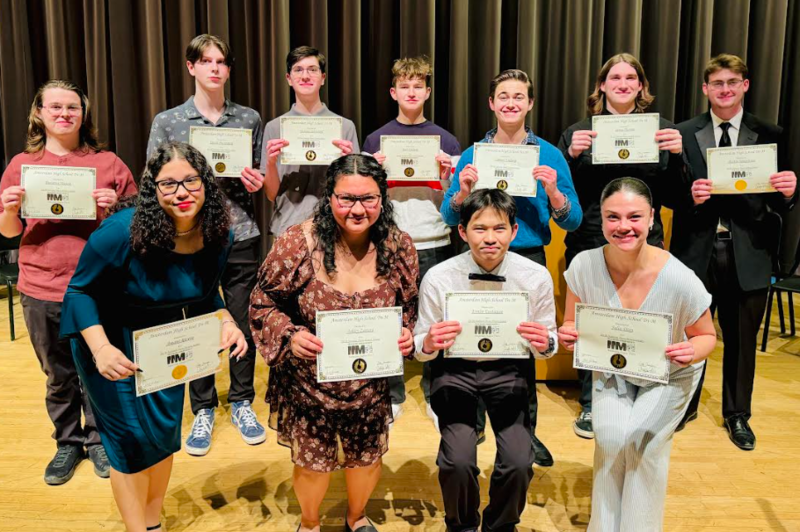 On Jan. 18, the Amsterdam High School Chapter of the Tri-M Music Honor Society hosted its induction ceremony. Tri-M, a National Music Honor Society, unites choral and band students demonstrating excellence in musicianship, service, and volunteerism in the music program. The ceremony, featuring student performances, was led by officers and included individual recognition of the 12 new inductees by the student membership.